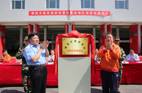 圖為聊城市副市長任曉旺(左一)和集團(tuán)公司董事長張金成(右一)為聊城市魯西集團(tuán)地震應(yīng)急救援揭牌。