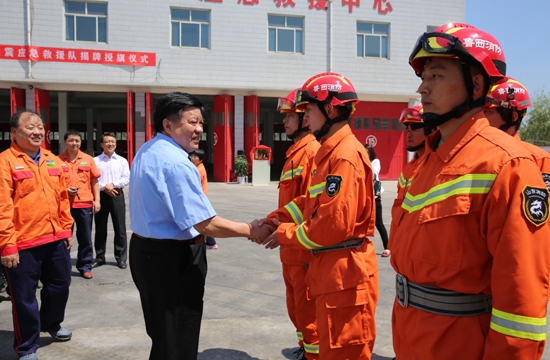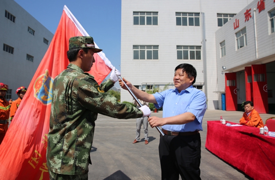 圖為任市長為魯西集團(tuán)應(yīng)急救援隊(duì)隊(duì)長授旗。