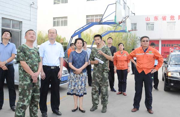 領(lǐng)導(dǎo)一行先后參觀了園區(qū)生產(chǎn)裝置、項(xiàng)目建設(shè)現(xiàn)場(chǎng)、應(yīng)急救援中心、實(shí)訓(xùn)基地、運(yùn)行指揮中心和產(chǎn)品展廳。在應(yīng)急救援中心,于娜政委實(shí)地了解了救援中心的營(yíng)房建設(shè)、設(shè)施器材配備、應(yīng)急救援指揮平臺(tái)建設(shè)等情況,并現(xiàn)場(chǎng)觀摩了隊(duì)員們的體能訓(xùn)練、技術(shù)競(jìng)賽科目演練,以及56米高空救援車和渦噴救援車的出水操作模擬演練情況。在運(yùn)行指揮中心,領(lǐng)導(dǎo)們通過智慧化工園區(qū)平臺(tái)詳細(xì)了解了集團(tuán)在安全、環(huán)保、消防應(yīng)急、節(jié)能和電商物流等方面的智能信息化管控情況。