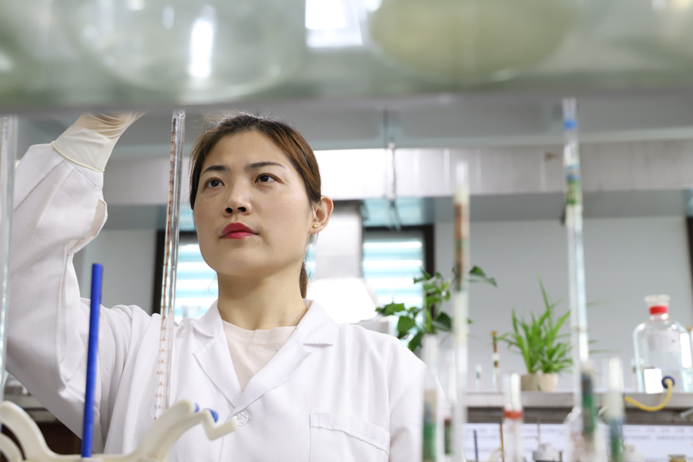 左手控制滴定管,右手握持化驗瓶,動作輕柔利落、表情專注從容,一滴、二滴……溶液顏色逐漸變化,確認滴定完畢,讀數(shù)、記錄,全過程精確把握、一氣呵成。