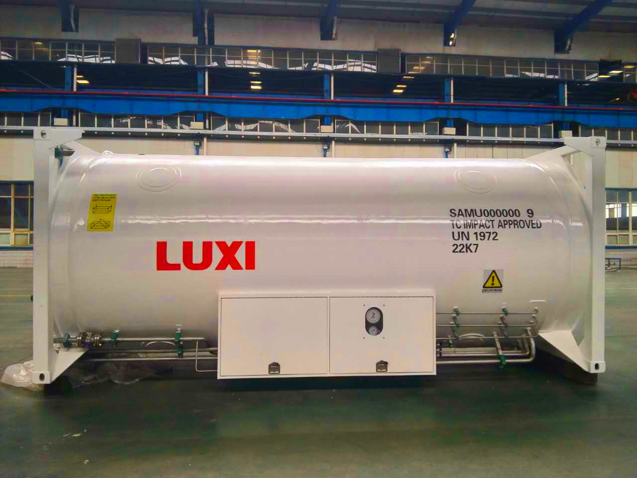 目前,魯西新能源裝備集團(tuán)制作的T75罐箱有兩種規(guī)格:20英尺、40英尺。該產(chǎn)品是由低溫冷凍液體儲罐、氣化器、管系、閥門等設(shè)備集中安裝至標(biāo)準(zhǔn)尺寸金屬框架內(nèi),嚴(yán)格執(zhí)行歐標(biāo)ADR、EN13530、CSC、IMDG等國際標(biāo)準(zhǔn)規(guī)范,主要用于充裝液化天然氣(LNG)、液氧(LO2)、液氮(LN2)、液氬(LAr)等低溫液體,可用于公路、鐵路及水路運(yùn)輸。罐箱相對于槽車和儲罐,有無可比擬的經(jīng)濟(jì)、高效便捷、安全、美觀、環(huán)保等優(yōu)勢。罐箱的使用,不會有繁瑣而耗時(shí)的槽車與儲罐等倒運(yùn)過程,可在公路、鐵路、水路之間直接轉(zhuǎn)換運(yùn)輸方式,操作簡單快捷,一步到位,可謂真正做到“門到門”運(yùn)輸。